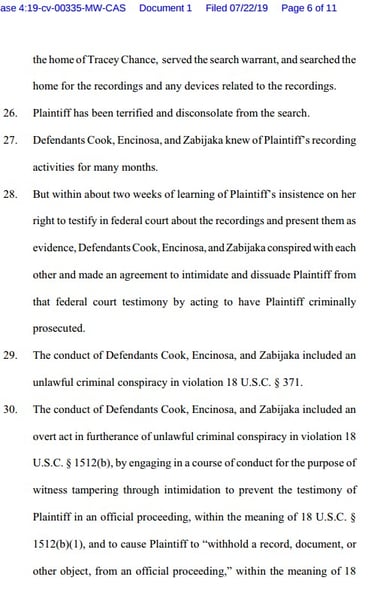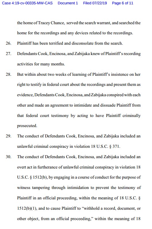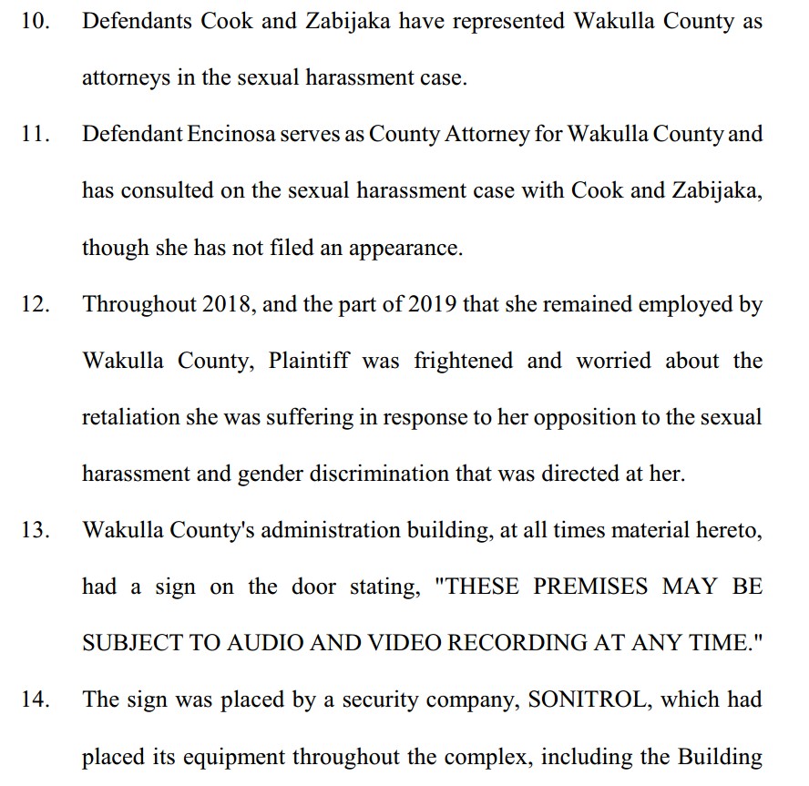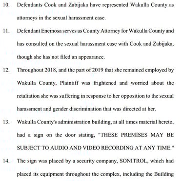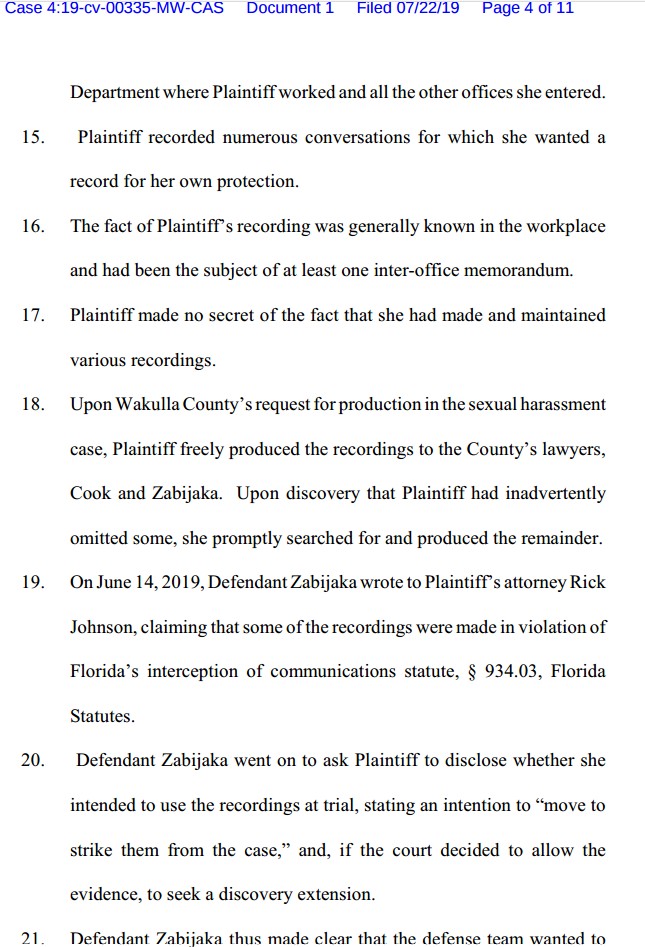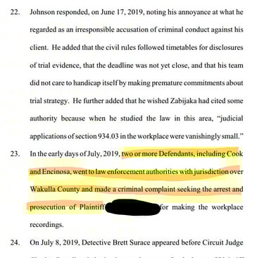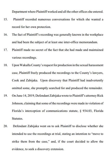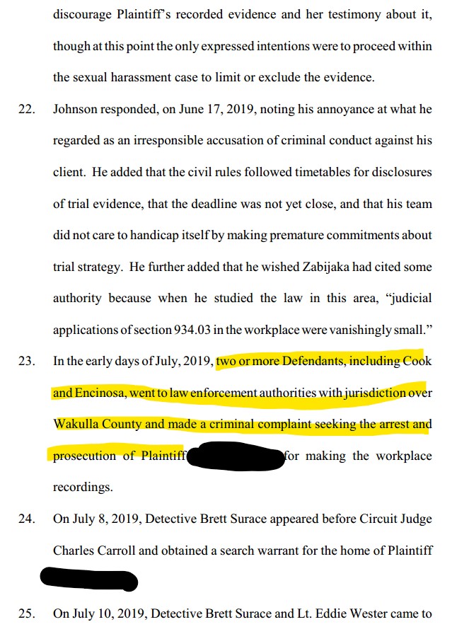 The turning point came in June 2019, when Zabijaka questioned the legality of Plaintiff’s recordings under Florida’s two-party consent law (§ 934.03, Florida Statutes), threatening to strike them from the case. Plaintiff’s attorney, Richard E. Johnson, dismissed the accusation as baseless, citing scant judicial precedent for applying the statute in workplace settings. But in early July 2019—months after Plaintiff’s employment ended on April 16—Cook, Encinosa, and Zabijaka allegedly took a drastic step: they reported her to Wakulla County law enforcement, seeking her arrest and prosecution.