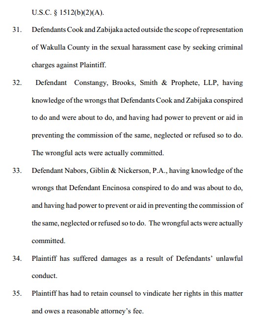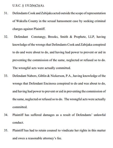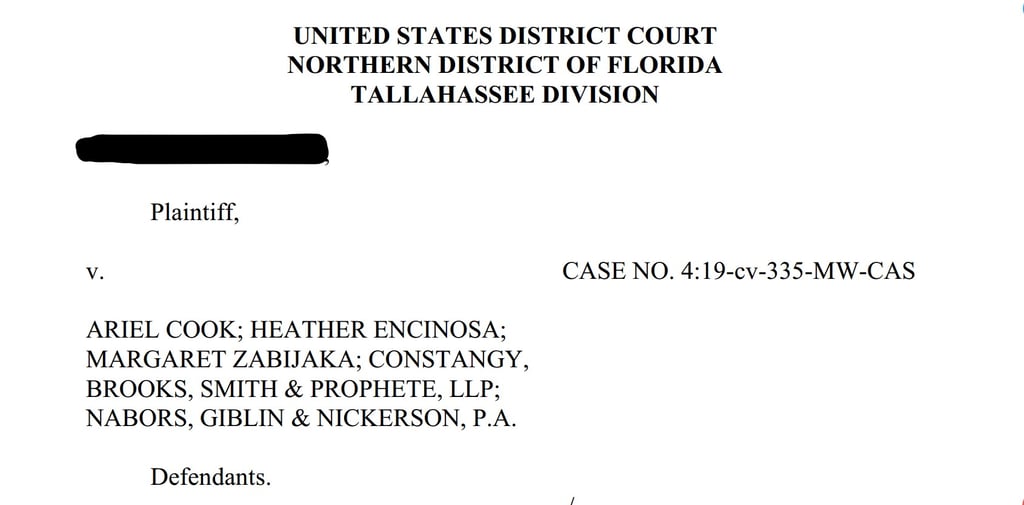 Plaintiff, a former employee of Wakulla County, Florida, has spent years battling what she described as a malicious conspiracy by attorneys Ariel Cook, Heather Encinosa, Margaret Zabijaka, and their respective law firms, Constangy, Brooks, Smith & Prophete, LLP, and Nabors, Giblin & Nickerson, P.A. Her allegations, rooted in a prior sexual harassment lawsuit against the county, painted a chilling picture of retaliation through a criminal complaint designed to silence her. Yet, despite her impassioned claims under the Civil Rights Act of 1871 (42 U.S.C. §§ 1985(2) and 1986), both the district court and the Eleventh Circuit Court of Appeals have dismissed her case, leaving the few who know about this feeling she got screwed by a system that shielded her adversaries.