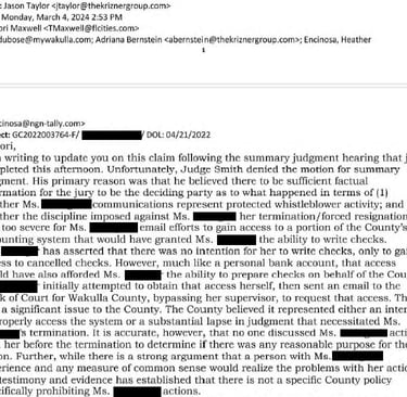 The judge presiding over the case rejected the county's petition for summary judgment. The judge emphasized that the determination of whether the employee's conduct constituted whistleblower activity was a matter for a jury to decide. Furthermore, the court highlighted that the appropriateness of the county's decision to terminate the employee, in light of the alleged whistleblowing, must also be evaluated within the context of a jury trial. The judge's decision ensures that these critical questions will be thoroughly examined in a courtroom setting. A string of emails regarding the denial of the summary judgement and settlement negotiations can be found here.