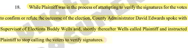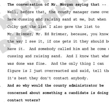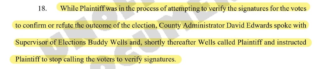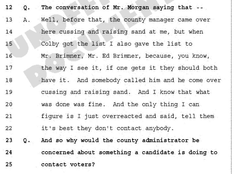 After Sparkman was terminated, Brimmer hired a twenty two year old who had not yet graduated college and had no experience GIS services, to replace Sparkman. Could this type of hiring practice been a precursor to a fat finger mistake? The rapid timing of the hire is also curious. Through further dissemination of records, a few excerpts of sworn deposition from former Supervisor of Elections, Buddy Wells revealed more detail on what sparked the cease and desist of Sparkman’s attempt to cure voting ballots and the County Administrator's contribution to the fiasco.