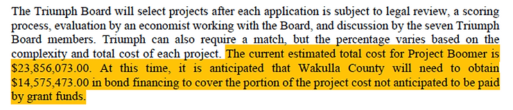 The below outlines that Project Boomer will cost 23.5 Million dollars with the county ponying up $14.5 Million. This means you, and your children, through bond financing, will pay the price to subsidize two for profit businesses.