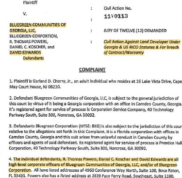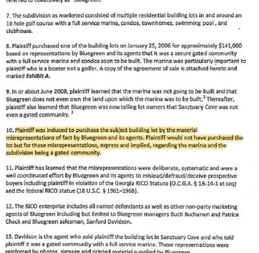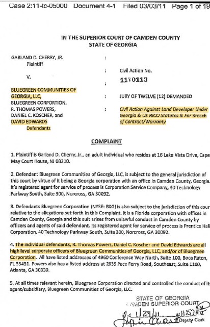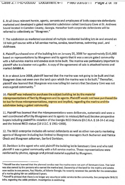 The development that was mentioned in the RICO case ties to the Sanctuary Cover & Estates Development in Camden County, GA shown above. The suit was filed in March of 2011. Edwards application to the Wakulla County BOCC was dated January 25, 2011 with a date available listed as "immediate" and he was voted in as the next County Administrator in June of 2011, with a start date in October of 2011. The suit outlines Edwards as one of the high level officers of Bluegreen Communities of Georgia, LLC and/or of Bluegreen Corporation. Below is the first two pages of the lawsuit. The issue would later enjoin more plaintiffs. The documents in this case are voluminous and while we did not pull all of them, what we did pull are located on the MediaFire drive for your digestion.