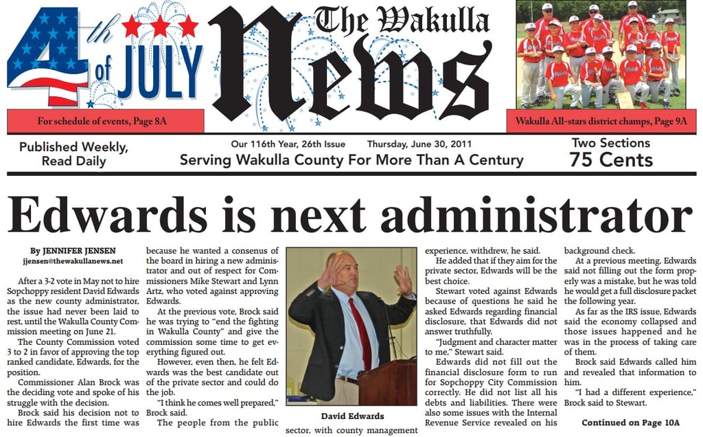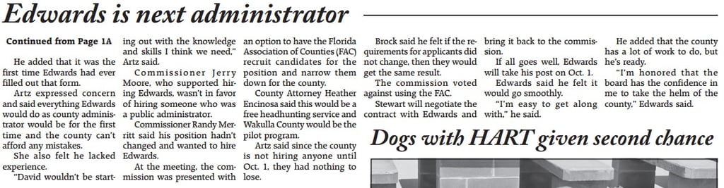In June, amidst the deliberations of the Wakulla County Commission, the news clips below reflected a significant decision: the selection of Edwards as the new county administrator. Commissioner supporters Jerry Moore, a real estate developer, and Randy Merritt, a well-known engineer, voiced their approval for this choice. However, the decision was not unanimous, as two commissioners expressed their opposition, with Commissioner Brock sitting uncomfortably on the fence, ultimately being the tiebreaker in favor. Although the formal hiring process was not expected to conclude until October, the commission's decision to expedite the selection process marked a turning point in the community’s governance, setting a new course for future development.