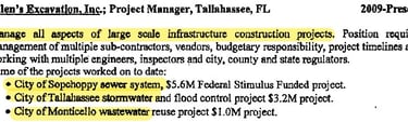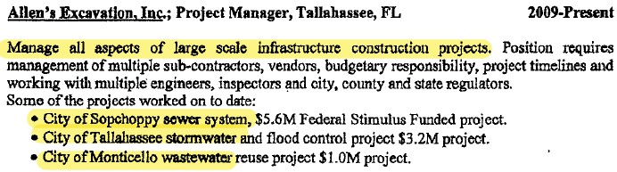 The last and most recent employment history displayed by Edwards resume is with Allen's Excavation as a Project Manager in Tallahassee, FL with a salary of $60k per year which is a far cry from the financial gain he experienced prior.