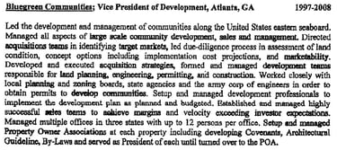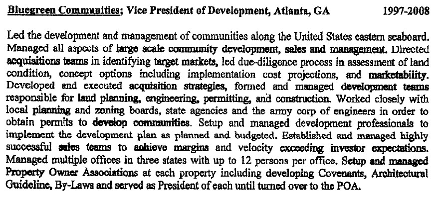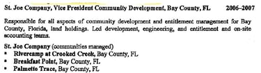 While being employed by Bluegreen from 1997 - 2008 the resume also lists an employment period with St. Joe Company in Panama City, FL (2006 - 2007) as a Vice President of Community Development. This position lists a starting and ending salary of $165,000.00 per year and states the reason for leaving was corporate downsizing. This portion of the resume also lists communities managed.