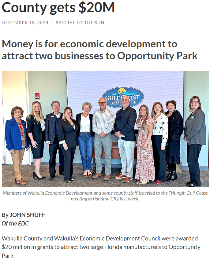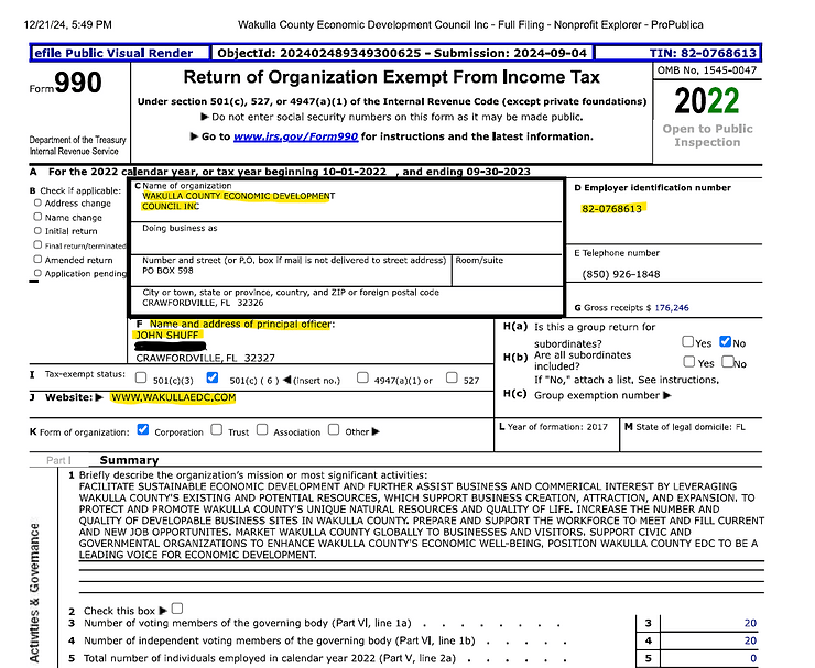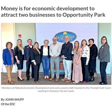 Despite Wakulla's lacking infrastructure and record-high debt, the EDC is flaunting the subsidization of two private businesses on the front page of The Wakulla Sun. These projects will not be creating 400 jobs immediately; the jobs are projected to be created over time, with potential clawbacks if the goal is not met. Special note: look at who wrote the article then reference the 990 form below.