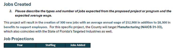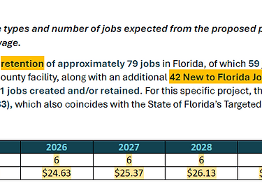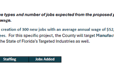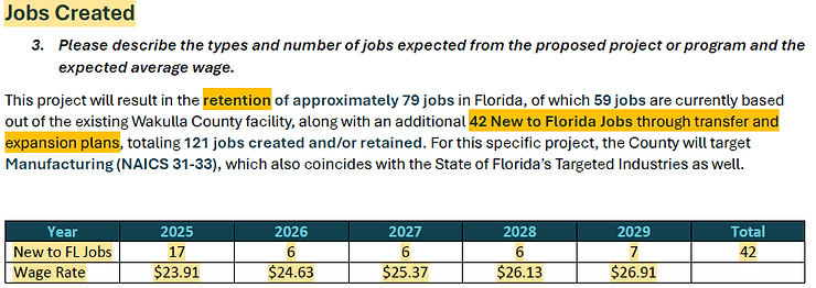 Project Boomer Job Projections (note that very little jobs are "created". Most are already here and most of the rest will be transferred). This project is creating 42 New to Florida jobs at the cost of additional bond financing (taxpayer debt) of 14.5 MILLION.