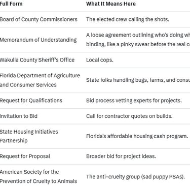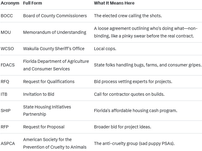 It's October 4, 2025, and the Wakulla County Board of County Commissioners (BOCC) agenda for Monday's 5:00 P.M. meeting is out. Since the full packet with backup documents wasn't provided—this is just a straightforward rundown based on the outline—no deep dives into the fine print. For the average John Q. Public trying to figure out if that $480K ambulance buy is really the best deal or if the Opportunity Park land grab comes with hidden strings, it's frustrating as hell. Where's the transparency? Those backups (budgets, contracts, reports) should be online days early, not buried or missing. If you're digging for details, hit the county site or call in—maybe that'll nudge 'em next time.