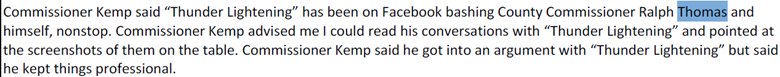 The investigation revealed that on April 23, 2024 Commissioner Ralph Thomas searched the Web Elect system for the victims name. Web Elect is a subscription only platform that offers Florida voter data and services for political candidates. The sign up feature requests a committee or campaign name indicating the individual accessing will need some type of sponsorship or affiliation. The next day, Kemp began using the victim’s name on social media when communicating with Thunder Lightening indicating Kemp thought he had identified the perceived internet troll’s real identity.
